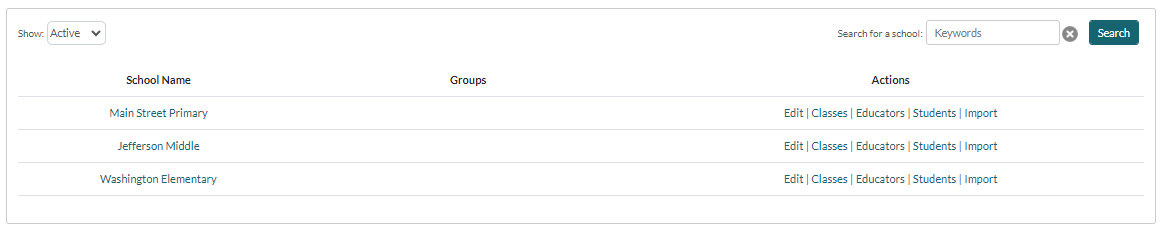 The Schools page opens, defaulted to show Active schools. Use the Search feature to quickly locate a school, should you have a large number of schools.