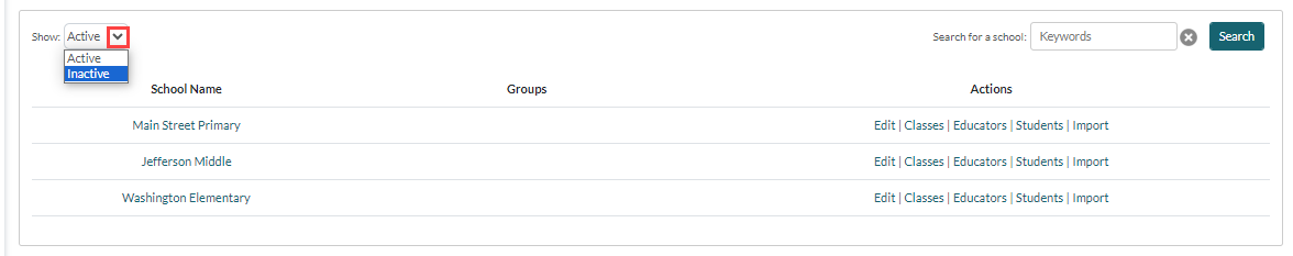Choose Inactive from the Show drop-down menu to view inactive schools.