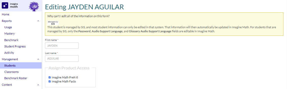 The same is true for many types of account edits—the changes must be made in the SIS and this will carry over to the Imagine Learning products via file synchronization. In fact, for Imagine Math SIS customers, only the Password, Audio Support Language, and Glossary Audio Support Language fields can be edited directly within the Imagine Math suite.