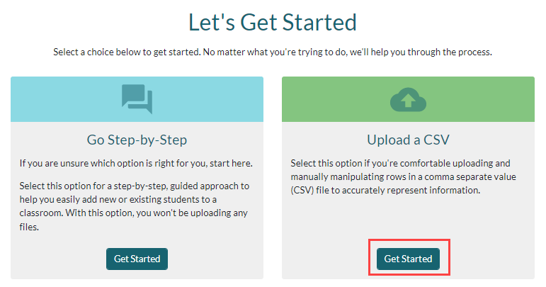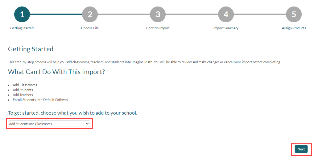 5. On the Getting Started screen, choose Add Students and Classrooms from the Select an Import Type drop-down menu, then click Next.