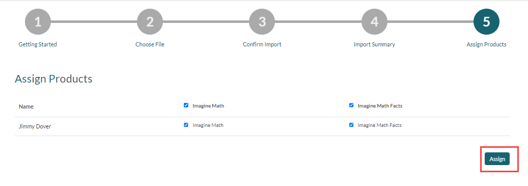 9. If your organization has purchased both Imagine Math and Imagine Math Facts, click Next. Check the appropriate program box(es) for each student, then click Assign.
