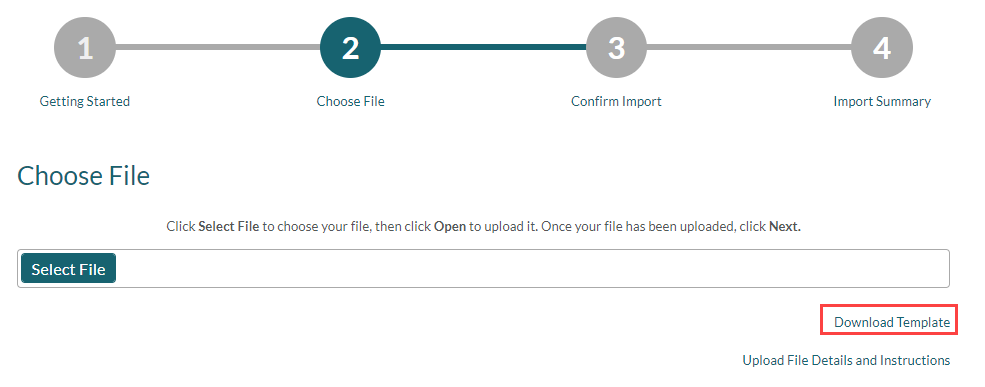 - On the Upload File screen, click Download Template. Fill out the file according to the specifications here. Required fields are marked with a red asterisk(*):
