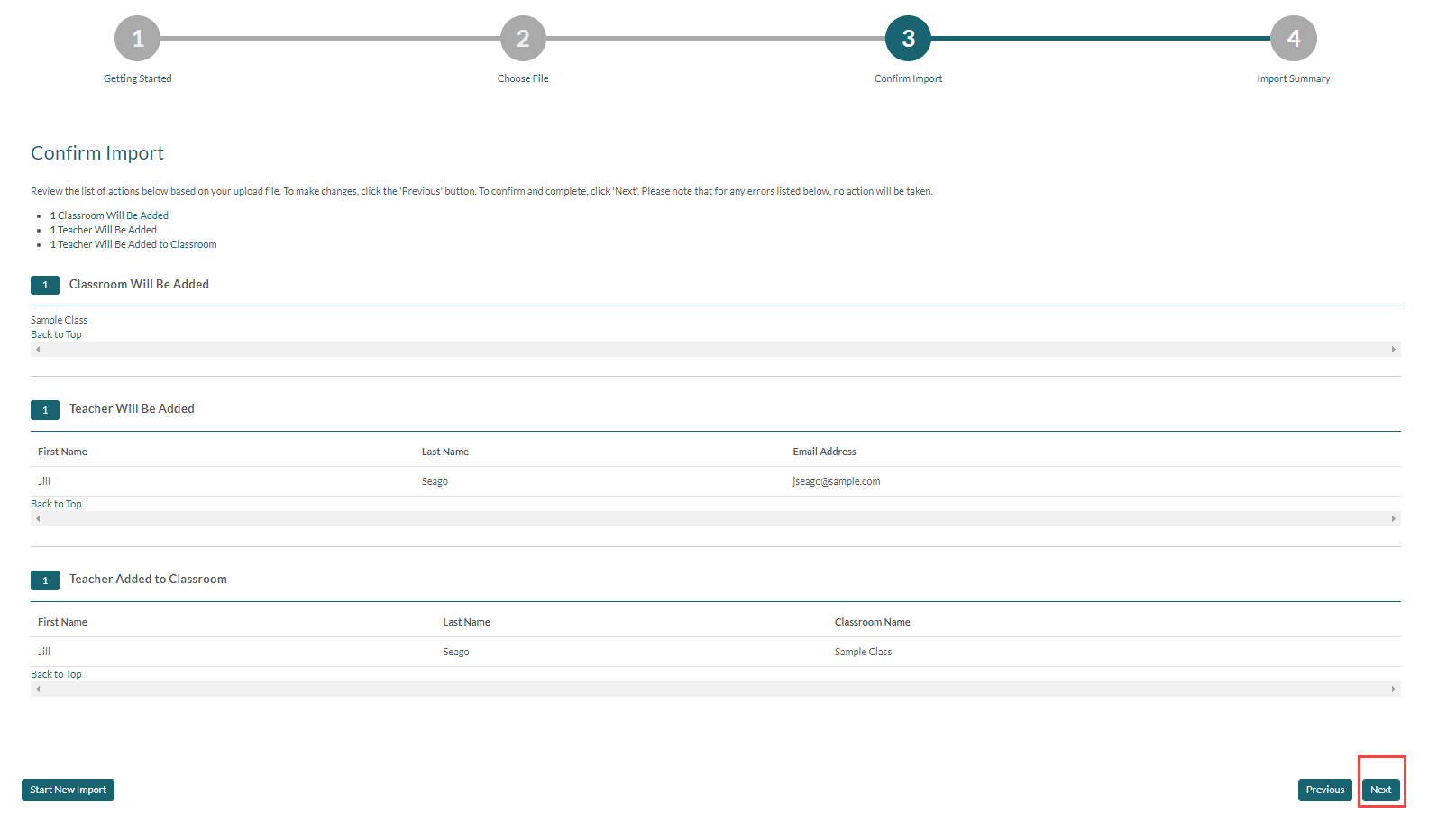 - On the Confirm Import page, review all information, correct errors if necessary, and click Next.