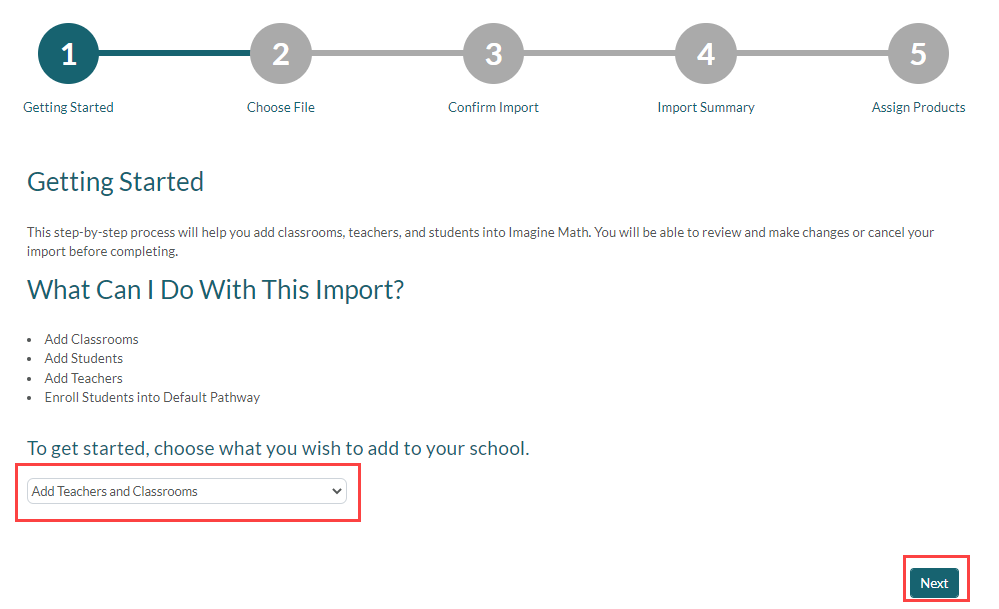 - On the Getting Started screen, choose Add Students and Classrooms from the Select an Import Type drop-down menu, then click Next.