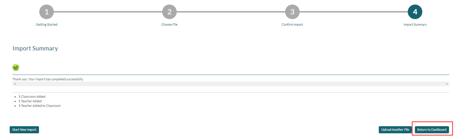 You'll receive a confirmation message. - You are finished with the import and can click Start New Import, Upload Another File, or Return to Dashboard.