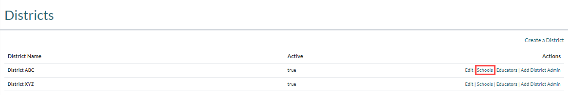 Term/Field Description School Name Lists the name for each school in your district. Clicking on the name opens a page of all classes in the school. Groups Lists the school groups that the school belongs to, if any, for reporting purposes. Edit Opens the School page where you can edit school information such as name, time zone, unique identifier, and any associated school groups. If your district has Imagine Math Facts, you can set Imagine Math Facts settings that will be the defaults for every class in the school. Classes Opens the Classes page where you can view and manage any class in that school. Educators Opens the Educators page where you can view and manage staff accounts for that school. Students Opens the Students page where you can view and manage student accounts for that school. Import Opens a rostering page where you can add students step-by-step or add students or teachers and classes in bulk from a CSV file. -