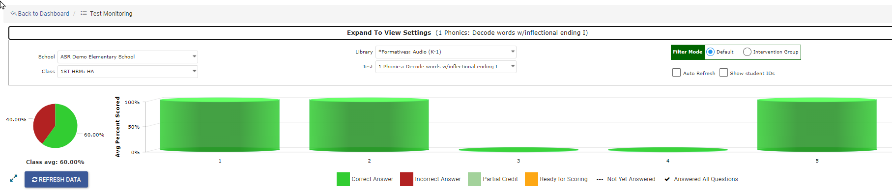 Depending on your selected test, Class or Intervention Group is the default mode. The library, the selected test, and displaying student IDs instead of student names are filled in by default, but can be changed in settings.