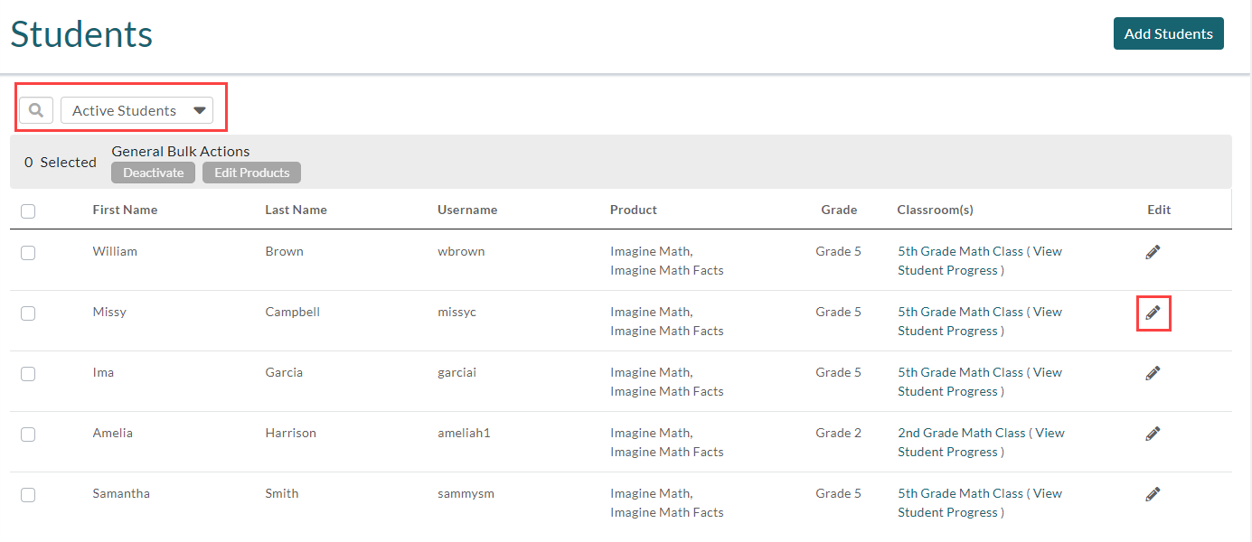 - Use the search feature and/or Active/Inactive filter to find the student, if necessary, then click Edit (